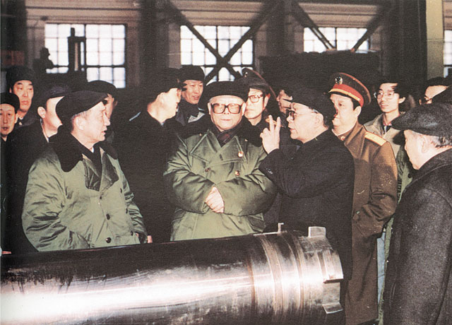 1990年2月17日中共中央總書(shū)記江澤民視察127廠(chǎng)時(shí)在車(chē)間聽(tīng)取匯報