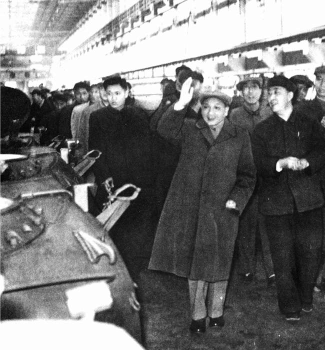 1964年4月8日中共中央總書(shū)記鄧小平視察617廠(chǎng)時(shí)在總裝車(chē)間向干部職工招手致意
