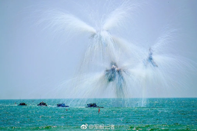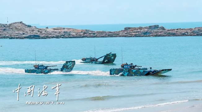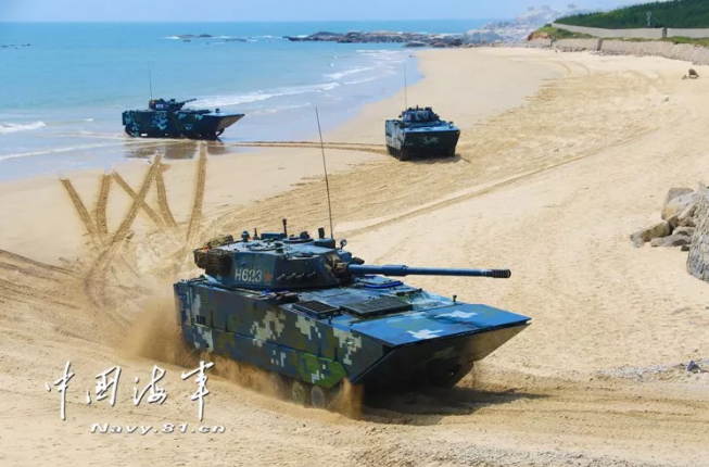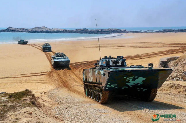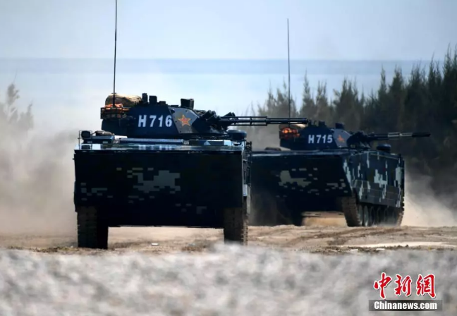 作戰課目演示中,兩棲裝甲車(chē)從海上發(fā)起沖擊,泛水抵灘后迅速鎖定目標,大口徑突擊炮、車(chē)載機槍連番開(kāi)火,遠方的靶標紛紛應聲而落。