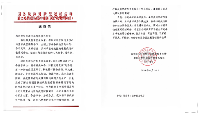 豫西集團鄭州紅宇專(zhuān)汽公司收到國務(wù)院應對新型冠狀病毒肺炎疫情聯(lián)防聯(lián)控機制醫療物資保障組發(fā)來(lái)的感謝信