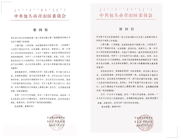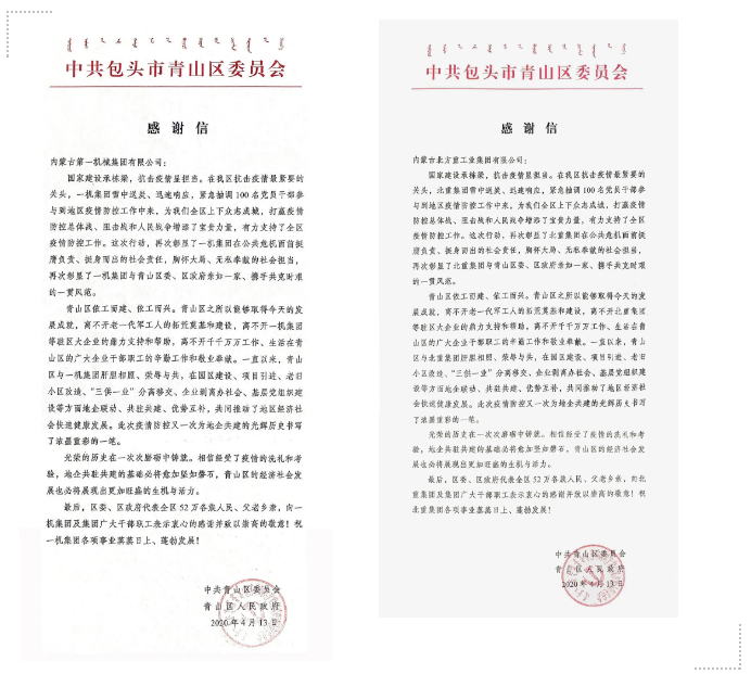 一機集團和北重集團收到中共包頭市青山區委員會(huì )、青山區人民政府發(fā)來(lái)的感謝信和慰問(wèn)信