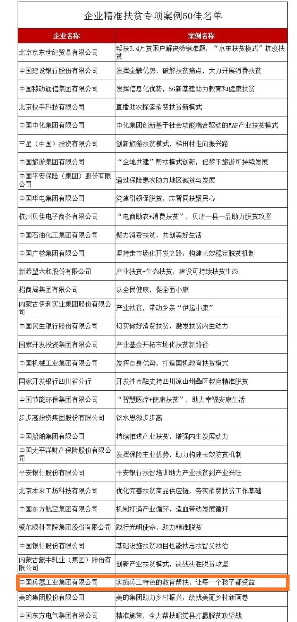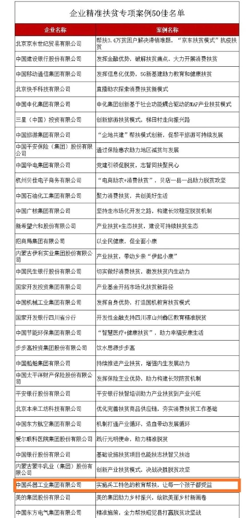 近日,國務(wù)院扶貧辦發(fā)布2020年企業(yè)精準扶貧案例獲獎名單,中國兵器工業(yè)集團有限公司《實(shí)施兵工特色的教育幫扶,讓每一個(gè)孩子都受益》案例入選2020年企業(yè)精準扶貧專(zhuān)項案例“50佳”。