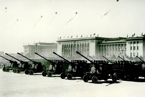 新中國首批研制生產(chǎn)的100毫米高射炮參加國慶10周年閱兵