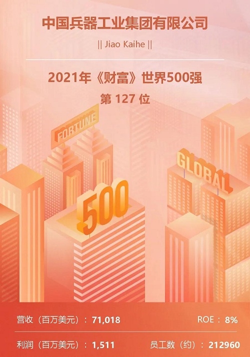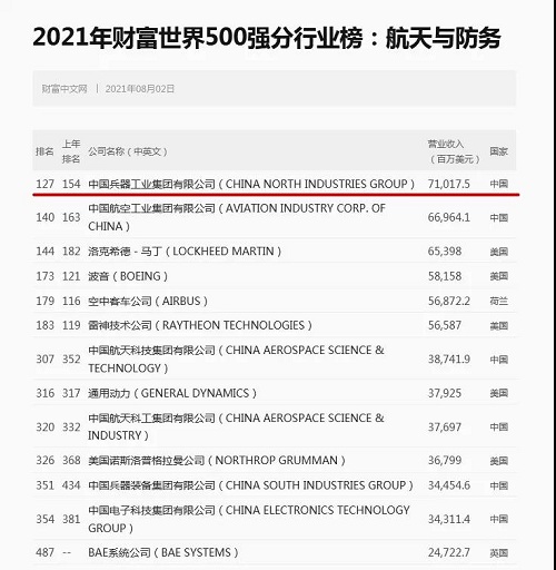 中國兵器工業(yè)集團有限公司位列世界500強第127位,連續12年上榜。
