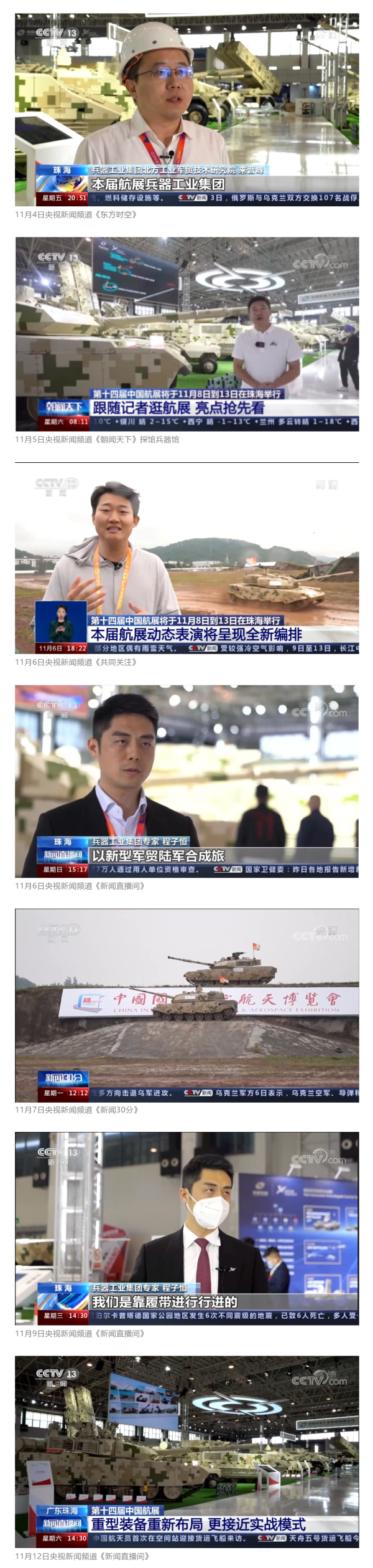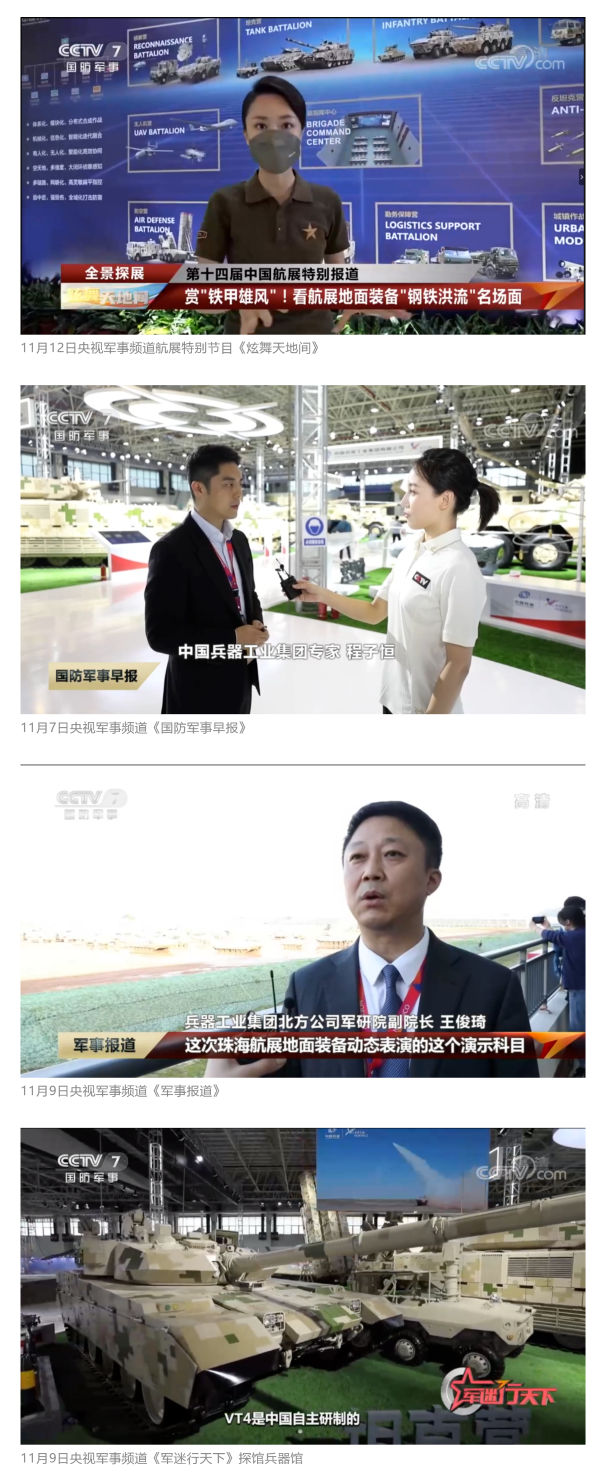 11月6日、7日、9日,央視《新聞聯(lián)播》三次報道兵器工業(yè)集團參展情況,重點(diǎn)介紹了集團公司總體參展情況、地面裝備動(dòng)態(tài)演示全新編排、國產(chǎn)輪式反伏擊車(chē)首次采用有人駕駛和無(wú)人駕駛混合編隊等內容。11月8日,央視新聞頻道直播地面裝備動(dòng)態(tài)演示;11月12日,央視新聞頻道航展特別報道《藍天盛會(huì )》探訪(fǎng)兵器館,采訪(fǎng)兵器工業(yè)集團嘉賓對陸軍合成旅作了報道。