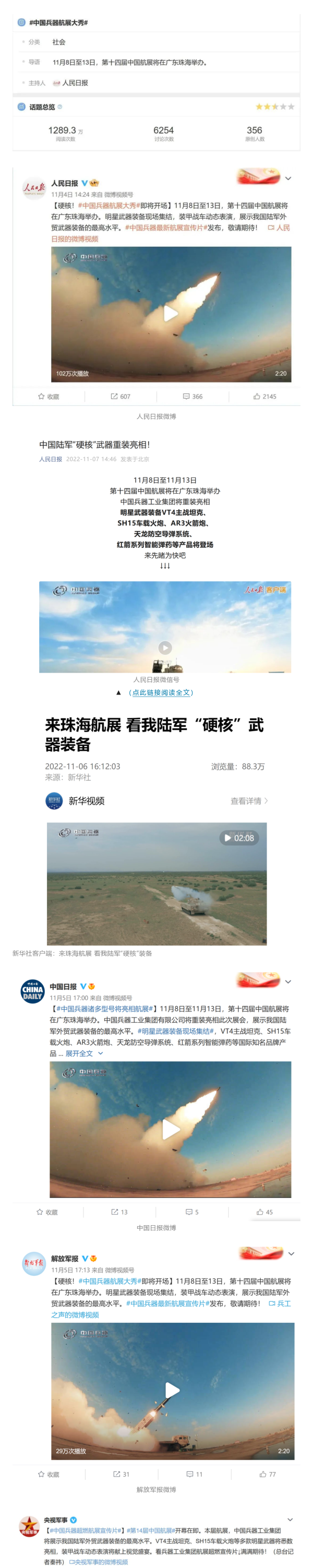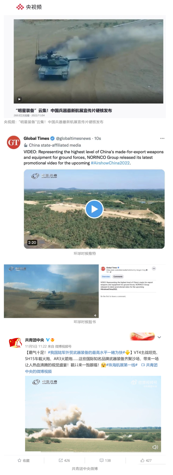 人民日報官方微博、微信公眾號,新華社客戶(hù)端、央視新聞客戶(hù)端、中國日報微博、參考消息微信公眾號、解放軍報微博、央視軍事微博、CGTN微博、中國軍號微博、共青團中央微博、環(huán)球時(shí)報(英文網(wǎng)站、臉書(shū)賬號、推特賬號)、嗶哩嗶哩、學(xué)習強國平臺、國資小新視頻號、網(wǎng)易軍事、騰訊軍事、鳳凰軍事、北京日報、東方衛視看看新聞全媒體、北京電視臺等20余家中央主流媒體、國家部委、省市媒體的新媒體第一時(shí)間播發(fā)集團公司航展宣傳片等視頻作品燃爆全網(wǎng),累計閱讀量突破1700萬(wàn)人次。集團公司微信公眾號、微博、抖音號、快手號、微信視頻號、知乎號等新媒體宣傳片播放閱讀量超過(guò)800萬(wàn)人次,點(diǎn)贊超過(guò)30萬(wàn)人次。集團公司微信公眾號推出《硬核!中國兵器最新航展宣傳片發(fā)布》《中國兵器航展節目單,請選出心中明星裝備》《航展首日,中國兵器閃耀亮相!》等7篇報道,閱讀量超過(guò)25萬(wàn)人次,集團公司微信視頻號、抖音號、快手號等新媒體賬號發(fā)布“中國兵器航展大秀”系列視頻,觀(guān)看量超過(guò)330萬(wàn)人次。