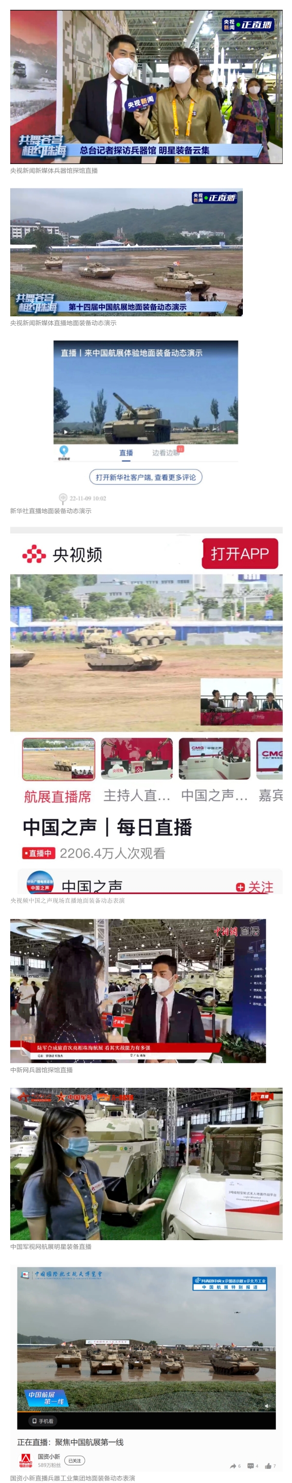 央視新聞新媒體、央視頻中國之聲、新華社、中國新聞網(wǎng)、中國軍視網(wǎng)、CGTN(微博、臉書(shū)、推特)等媒體以及國資小新、共青團中央、鳳凰軍事等到兵器工業(yè)集團地面動(dòng)態(tài)演示區、中國兵器館進(jìn)行了直播。航展期間,集團公司微信視頻號、微博、抖音號、快手號共進(jìn)行8次直播,最高觀(guān)看人數突破24萬(wàn)。
