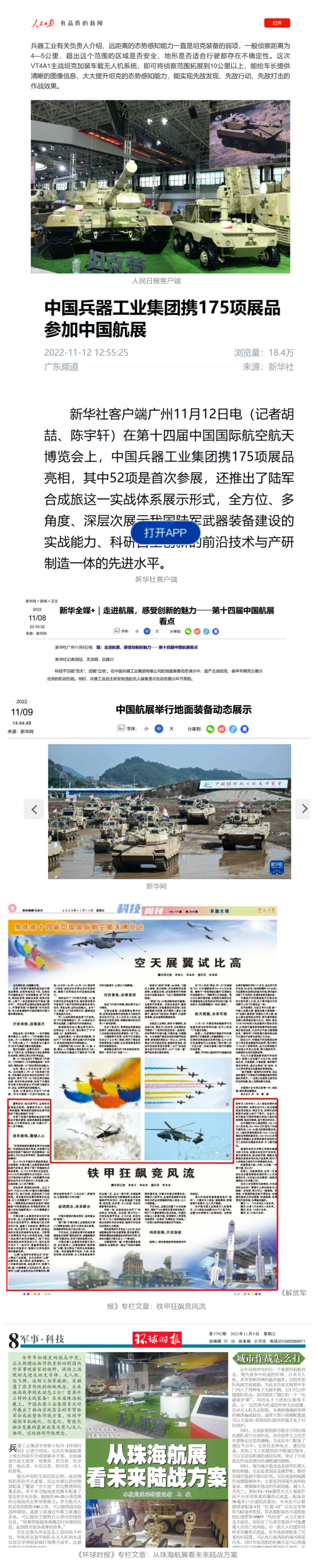 央視國防軍事頻道航展特別報道《炫舞天地間》11月12日《賞“鐵甲雄風(fēng)”!看航展地面裝備“鋼鐵洪流”名場(chǎng)面》對兵器工業(yè)集團武器裝備特色亮點(diǎn)進(jìn)行報道?!秶儡娛略鐖蟆?1月7日推出報道《第十四屆中國國際航空航天博覽會(huì )明天開(kāi)幕 中國兵器館首次以陸軍合成旅實(shí)戰體系形式展出》,對兵器館陸軍合成旅實(shí)戰體系進(jìn)行報道?!盾娛聢蟮馈?1月9日推出《第十四屆中國國際航空航天博覽會(huì ) 地面兵器裝備首次聯(lián)合陸航直升機進(jìn)行動(dòng)態(tài)展示》報道?!盾娒孕刑煜隆?1月9日推出報道《軍迷打卡航展2022》以專(zhuān)業(yè)軍迷視角探館兵器館,全面展示兵器工業(yè)集團參展裝備特色亮點(diǎn)。