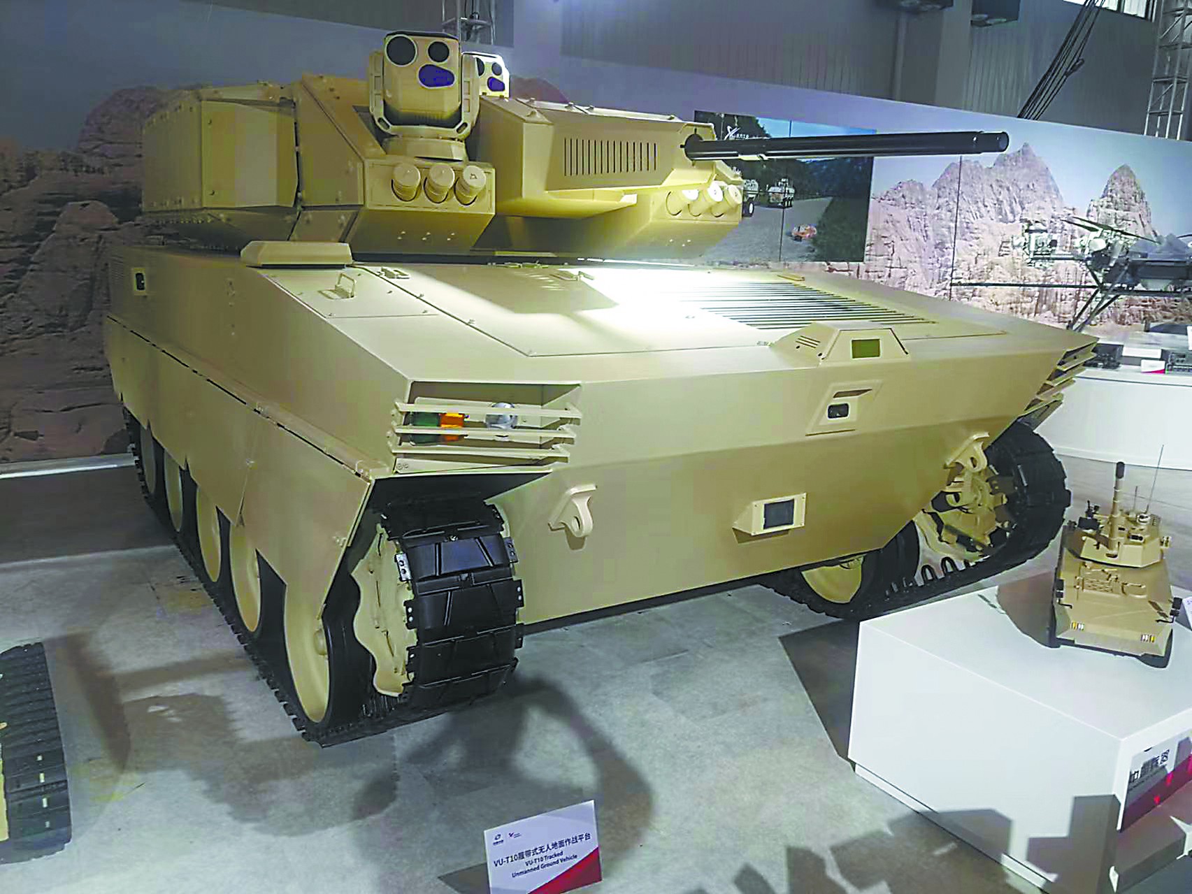 相比各種無(wú)人機和巡飛彈,珠海航展上的無(wú)人地面作戰車(chē)輛在作戰性能上也毫不遜色。除了VT-5U輕型坦克可以臨時(shí)客串“無(wú)人坦克”外,兵器工業(yè)集團的VU-T10履帶式無(wú)人地面作戰平臺也堪稱(chēng)重型無(wú)人車(chē)輛。VU-T10主要針對城市環(huán)境作戰,選擇采用厚重的履帶式底盤(pán),配備有30毫米口徑遙控武器站,未來(lái)還可以根據需要配備4枚“紅箭-12”反坦克導彈,加載7.62毫米機槍?zhuān)湮淦髋鋫涞呢S富程度相比俄羅斯BMPT“終結者”火力支援車(chē)也不遜色,卻沒(méi)有了后者在巷戰中可能遭遇人員傷亡的風(fēng)險。