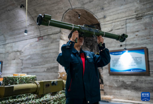 5月16日,一名工作人員在中國光學(xué)歷史博物館內展示對空測距機使用方法。