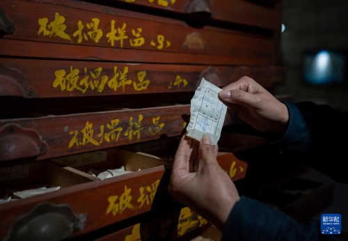 5月16日,工作人員在展示玻璃樣品柜內的一個(gè)玻璃樣品。