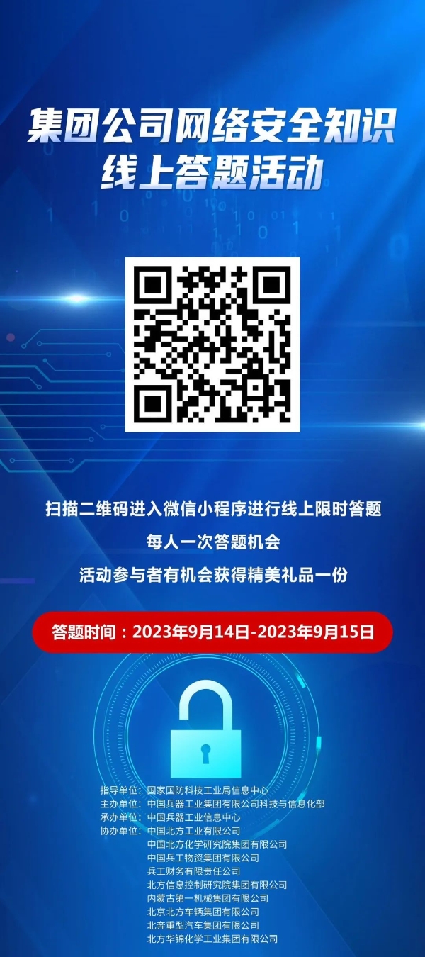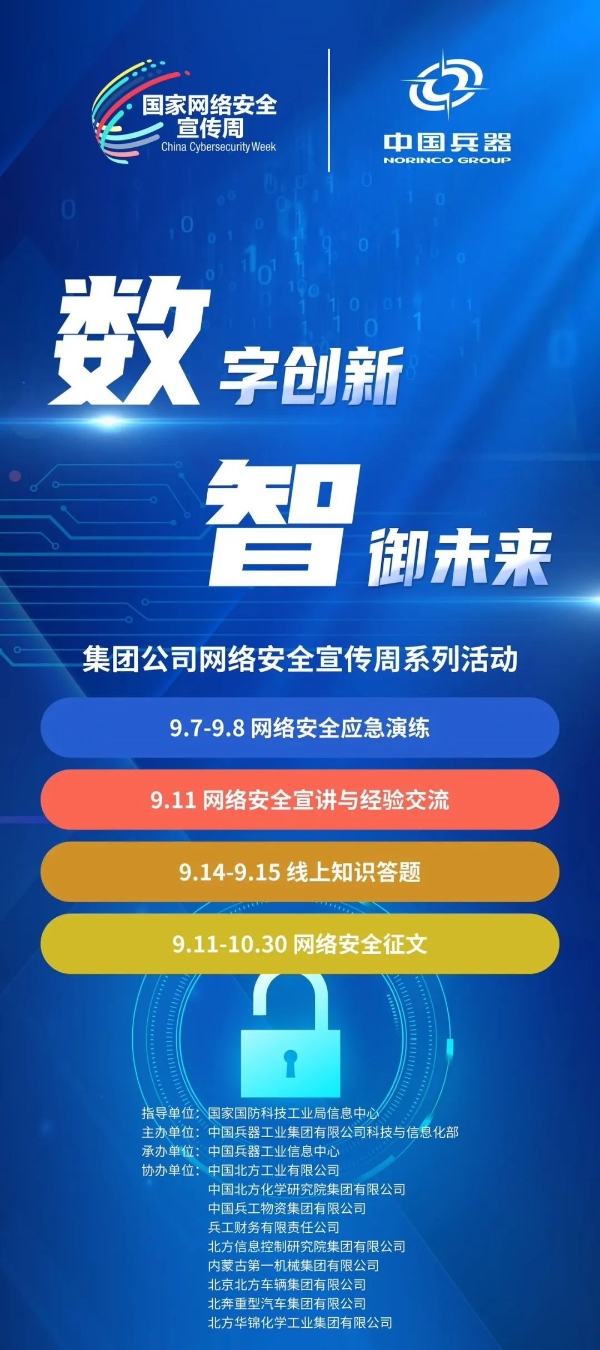 9月11日至17日,中國兵器工業(yè)集團有限公司以“數字創(chuàng )新 智御未來(lái)”為主題,圍繞集團公司“1+5”戰略和“雙十”規劃,組織開(kāi)展集團公司網(wǎng)絡(luò )安全宣傳周系列活動(dòng)。 9月11日,集團公司科技與信息化部組織在京單位召開(kāi)網(wǎng)絡(luò )安全宣講與經(jīng)驗交流活動(dòng),邀請公安部第一研究所網(wǎng)絡(luò )安全專(zhuān)家針對網(wǎng)絡(luò )安全形勢和個(gè)人防護技能以及網(wǎng)絡(luò )安全等級保護主要工作環(huán)節和標準應用作專(zhuān)題講座,會(huì )上北方公司、物資集團、財務(wù)公司、北方車(chē)輛集團、北奔重汽進(jìn)行了工作經(jīng)驗分享。