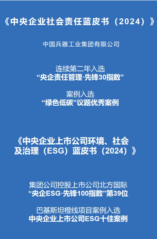 國有企業(yè)社會(huì )責任平行論壇現場(chǎng)發(fā)布了《中央企業(yè)社會(huì )責任藍皮書(shū)(2024)》《中央企業(yè)海外環(huán)境、社會(huì )及治理(ESG)藍皮書(shū)(2024)》《中央企業(yè)上市公司環(huán)境、社會(huì )及治理(ESG)藍皮書(shū)(2024)》等系列成果。其中,集團公司連續第二年入選“央企責任管理·先鋒30指數”榜單,集團公司案例入選“綠色低碳”議題優(yōu)秀案例,所屬控股上市公司北方國際入選“央企ESG·先鋒100指數”第39位,巴基斯坦橙線(xiàn)項目案例入選中央企業(yè)上市公司ESG十佳案例。