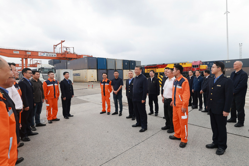 4月22日至24日,中共中央總書(shū)記、國家主席、中央軍委主席習近平在重慶考察。這是22日下午,習近平在重慶國際物流樞紐園區重慶鐵路集裝箱中心站,同貨車(chē)司機、列車(chē)司機、裝卸工人、場(chǎng)站管理人員等親切交流。