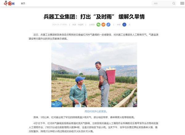 5月27日,中國網(wǎng)刊發(fā)《兵器工業(yè)集團:打出“及時(shí)雨” 緩解久旱情》,對中國兵器工業(yè)集團有限公司助力云南省紅河州人工影響天氣、氣象監測建設等方面作出的突出貢獻作了報道。 兵器工業(yè)集團:打出“及時(shí)雨” 緩解久旱情 近日,兵器工業(yè)集團收到來(lái)自定點(diǎn)幫扶的云南省紅河州氣象局的一封感謝信,對兵器工業(yè)集團在人工影響天氣、氣象監測建設等方面作出的突出貢獻表示感謝。 原來(lái),3月以來(lái),紅河縣出現了罕見(jiàn)的持續高溫少雨天氣,部分地區特旱,森林草原火險等級較高。 4月1日下午,紅河州氣象局發(fā)現將會(huì )有強對流天氣影響,立即安排兵器造人工增雨作業(yè)車(chē)輛前往樂(lè )育甲寶作業(yè)點(diǎn)等待實(shí)施人工增雨作業(yè),21時(shí)20分成功發(fā)射增雨火箭彈4枚,全縣大部地區下起小雨。當天下午,寶華與樂(lè )育交界處突發(fā)森林火情,情況較復雜,持續20分鐘的小雨過(guò)程成功協(xié)助滅火隊員撲滅火情。