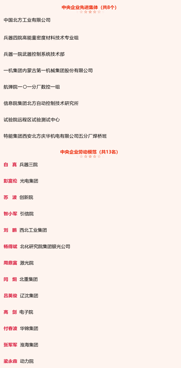 兵器工業(yè)集團8個(gè)集體和13名個(gè)人獲中央企業(yè)先進(jìn)集體和勞動(dòng)模范表彰 |
